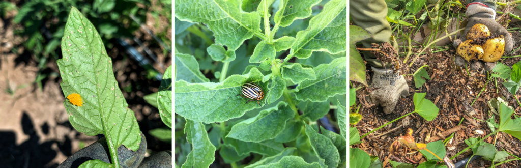 - Potato Beetles: These colourful beetles lay yellow eggs on the leaf undersides (photo on the left, above). The larvae can quickly eat all the leaves; once they are spotted, use diatomaceous earth at the first sign of infestation and check the bottom of all leaves on a weekly basis to scrape off any eggs before they hatch. The centre photo is of a mature potato beetle.